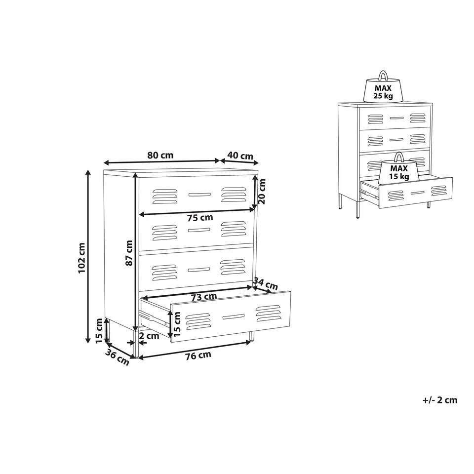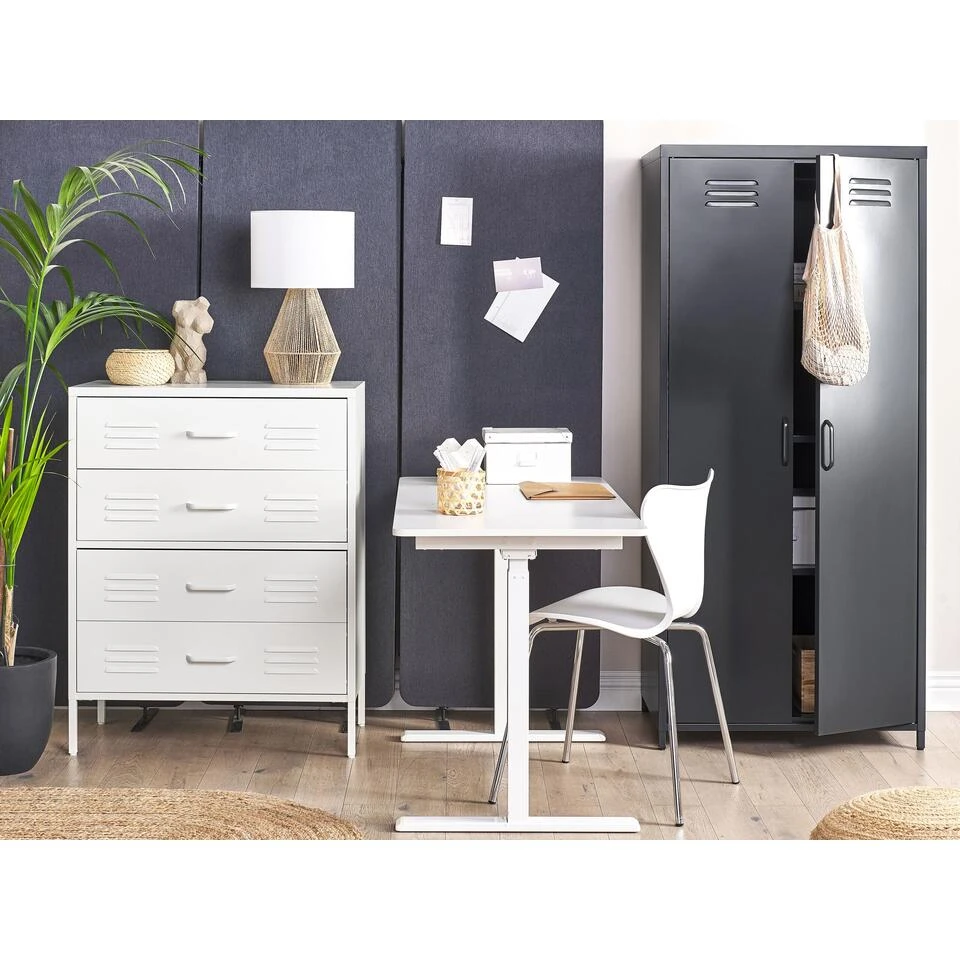 Witte ladekast van stevig metaal met ventilatiesleuven. Deze functionele ladekast ontworpen in industriële stijl wordt geleverd met vier lades. De kast is gemaakt van stevig metaal, wat hem bijzonder duurzaam maakt. De hoogwaardige poedercoating maakt de oppervlakken onderhoudsvriendelijk en verhoogt de corrosiebestendigheid van het meubel. Dankzij de minimalistische look is de ladekast een prachtige aanvulling op zowel een slaapkamer als een thuiskantoor.