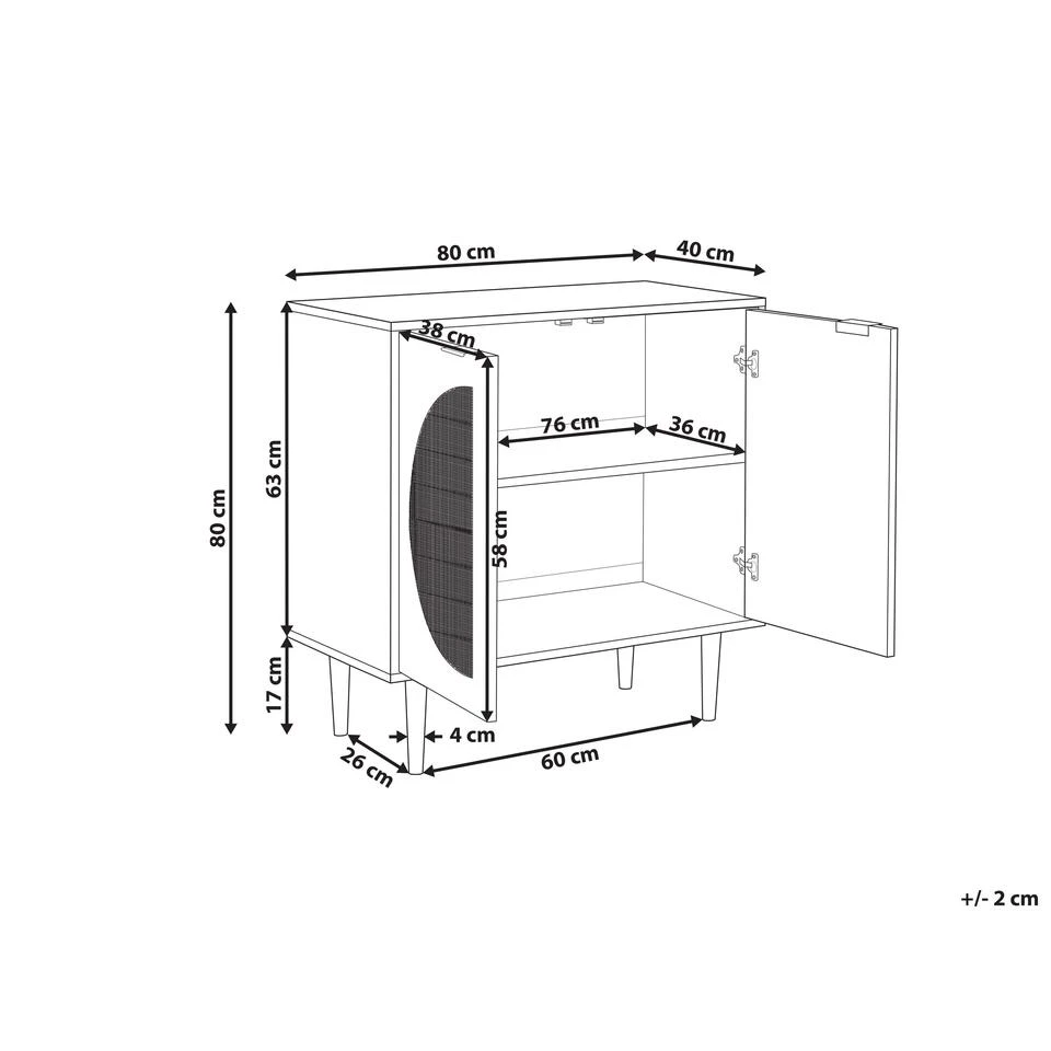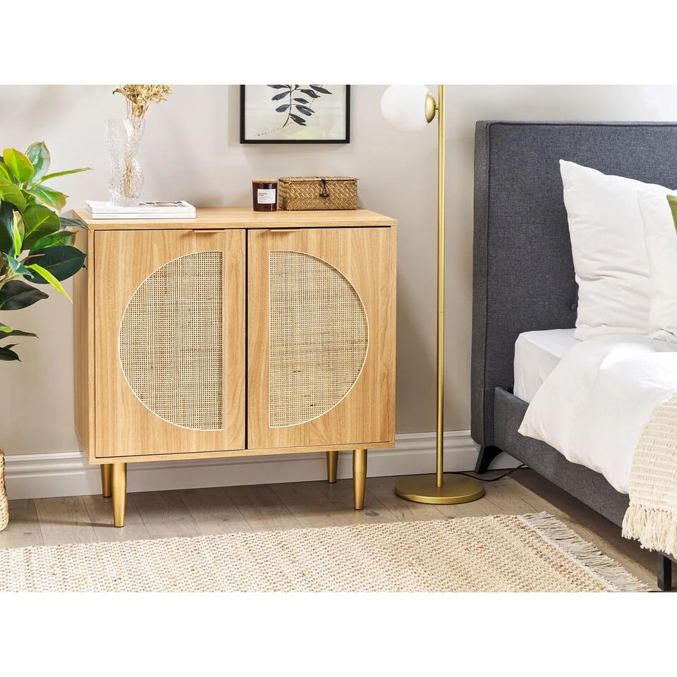 Kast met rotan frontjes. Geïnspireerd door de boho-trend, is dit dressoir met 2 deuren een fantastische aanvulling op alle moderne woonruimtes. De natuurlijke uitstraling, met een houtachtige afwerking en rotan fronten, zal elk interieur opfleuren en een elegante uitstraling geven. De kast is gemaakt van MDF en spaanplaat en staat op stevige metalen poten. De planken bieden voldoende opbergruimte, terwijl de bovenkant perfect is voor het presenteren van ingelijste foto’s of decorstukken.