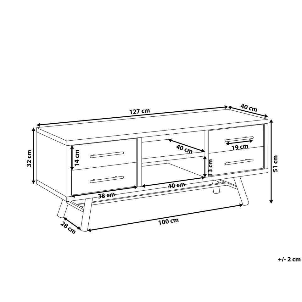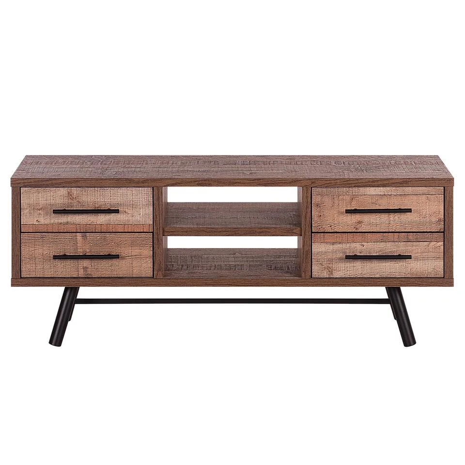 Rustiek tv-meubel met 4 laden. Organiseer je woonkamer opnieuw met dit ruime tv-meubels met een rustieke uitstraling. De tv kast biedt een verscheidenheid aan opslag-mogelijkheden: twee diepe, open planken en vier ruime laden. Het lowboard staat op vier stevige metalen poten en is zeer geschikt voor het plaatsen van je tv en aanverwante apparatuur zoals gameconsoles of een blue-ray-speler.