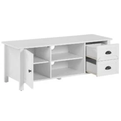Rustiek TV-meubel met veel opbergruimte. Een klassiek tv-meubel is handig in elke woonkamer. Dankzij de royale opbergruimte kunnen tv-accessoires of andere dingen netjes worden opgeborgen, en een speciale opening voor kabelbeheer maakt het gemakkelijk om ze netjes weggestopt en uit de knoop te houden. De kast is gemaakt van stevig gelamineerd spaanplaat, wat duurzaamheid garandeert en tegelijkertijd niet veeleisend is qua onderhoud.
