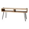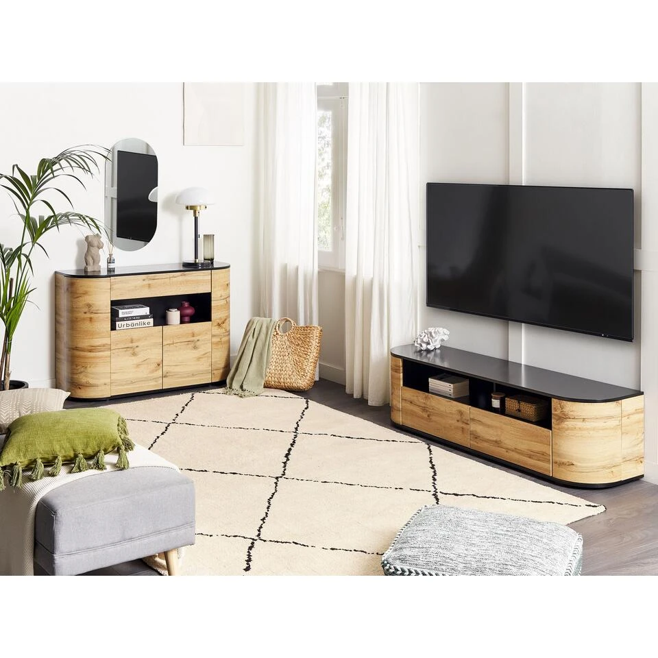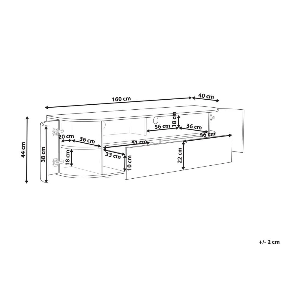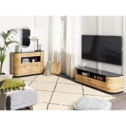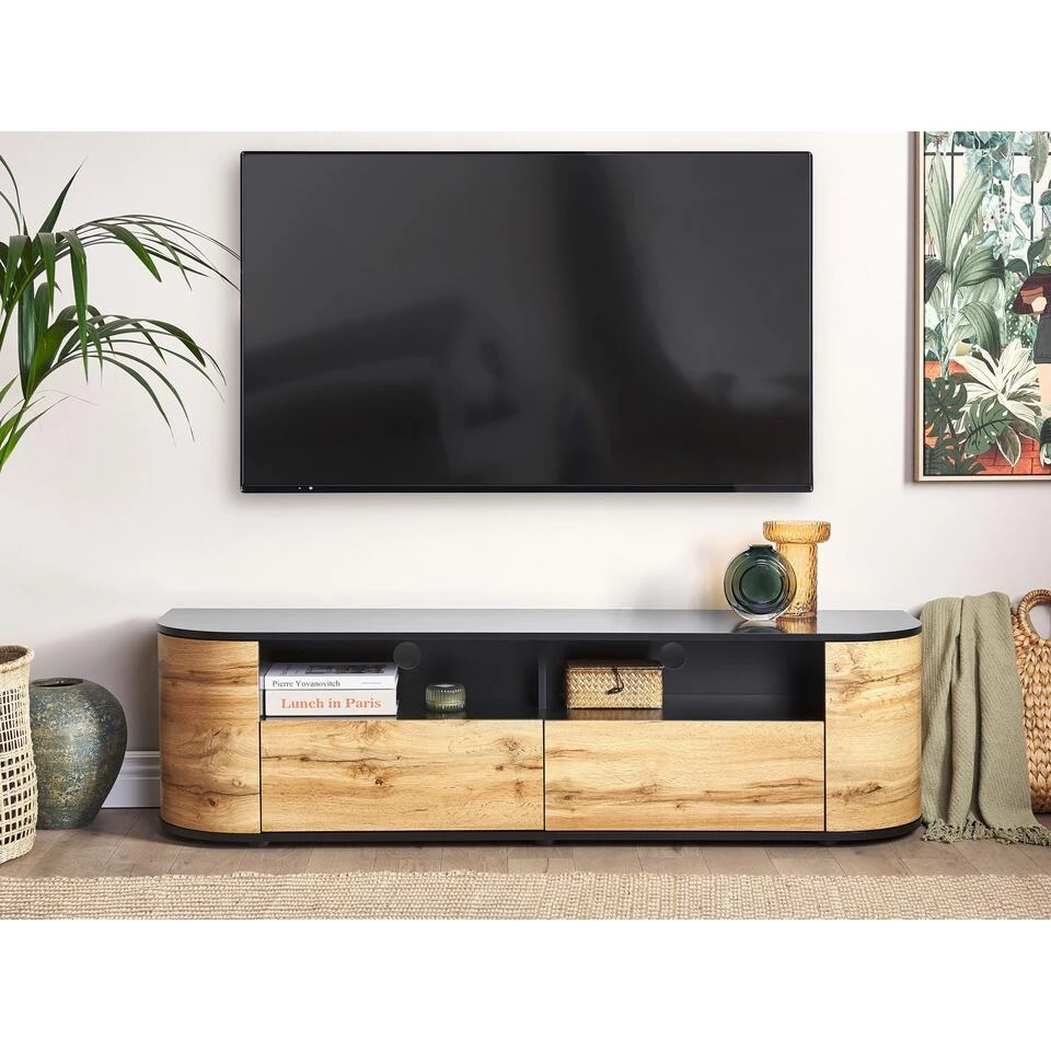 Kast met 2 lades voor een TV tot 55”. Maak je woonkamer af met dit functionele meubelstuk. Het trendy, rustieke design past bij veel interieurstijlen. Het bestaat uit twee lades en gebogen kasten met planken, die veel ruimte bieden voor boeken, games of andere benodigdheden. Twee open planken bieden ruimte voor verschillende media-apparaten en dankzij de kabelmanagement aan de achterkant kunnen de kabels worden verborgen. Het brede platform biedt ruimte voor diverse decoraties of zelfs een 55สบ tv. Het gehele meubel is gemaakt van onderhoudsvriendelijke en hoogwaardige MDF-plaat.