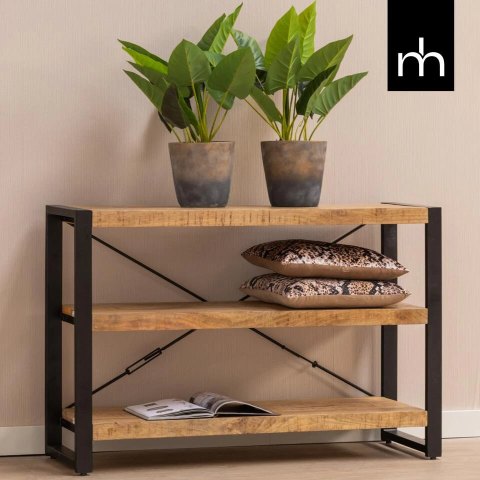 De lage variant van de boekenkast Minneapolis is een praktische en stoere boekenkast voor in jouw interieur dat door zijn lage formaat ook nog eens weinig ruimte inneemt. Door de twee stalen stangen aan de achterkant, is deze boekenkast extra stevig. Door de open achterkant is de kast ook geschikt om gebruikt te worden als televisiemeubel!