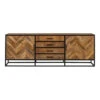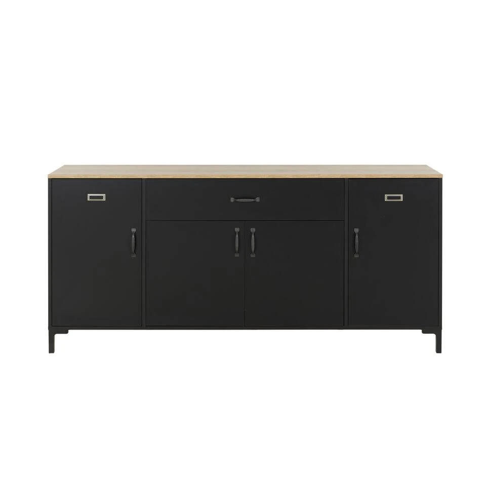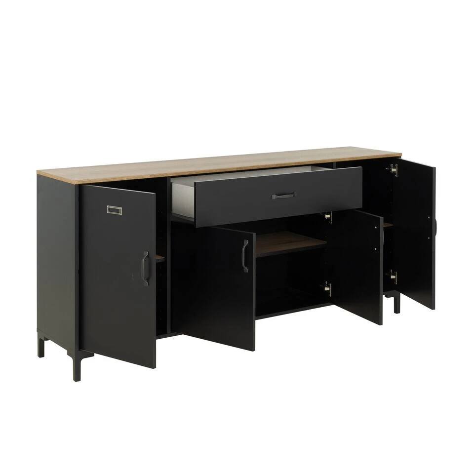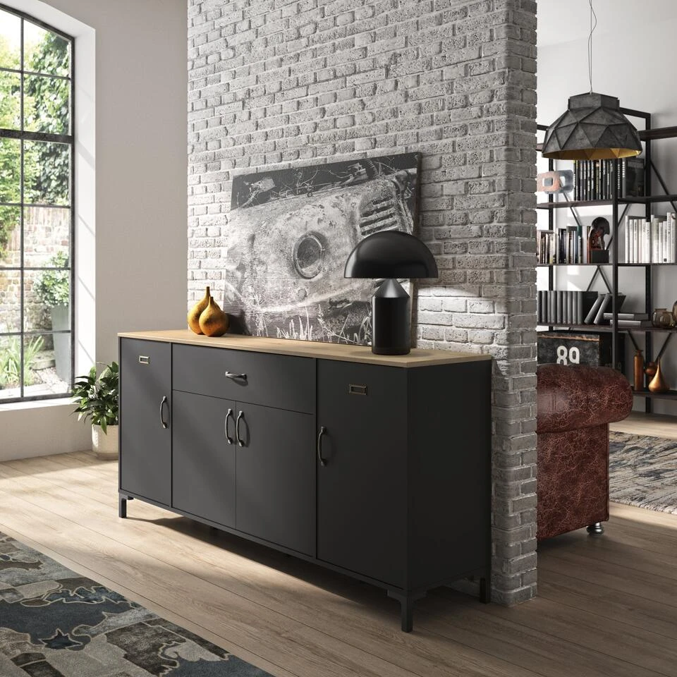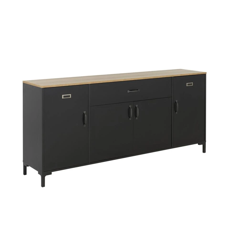 Met zijn metalen labelhouder op de 2 buitenste deuren en zijn ABS-handgrepen met verouderde metalen imitatie, biedt deze dressoir een industriële uitstraling die perfect past in een modern interieur. Het zwart en eiken bicolour voegt een vleugje verfijning toe aan uw decoratie.