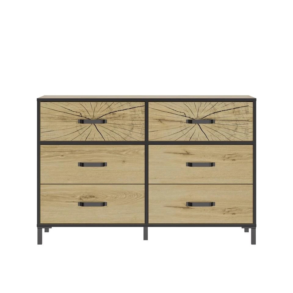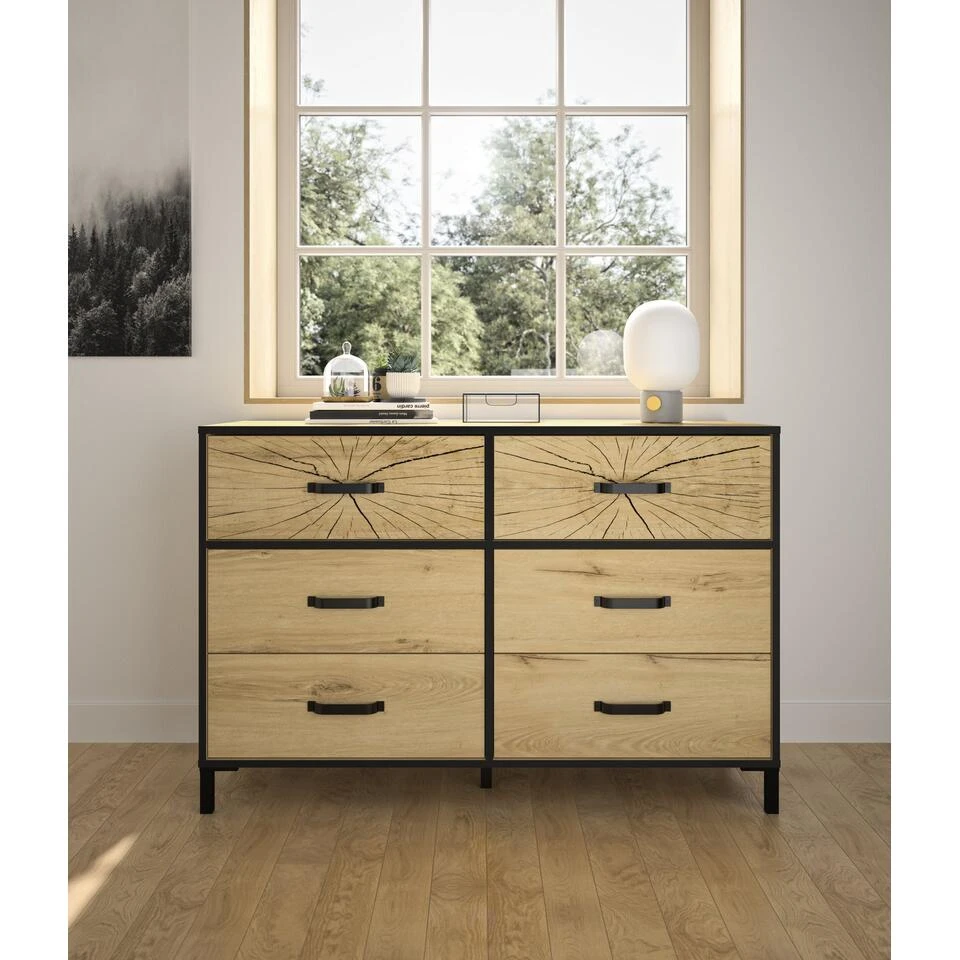 Met een diepte van 45 cm biedt deze kast geoptimaliseerde opslagruimte voor uw kleding. Sommige randen zijn zwart voor een industriële uitstraling die perfect past bij het algehele ontwerp van het meubel. De 6 laden bieden u altijd meer ruimte om uw kleding beter te organiseren.