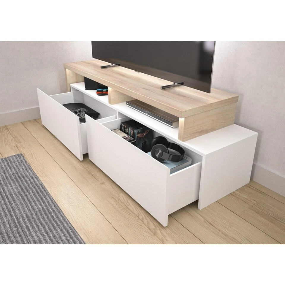 De TV-meubel MIKE is ook ontworpen om in een hoek te worden gemonteerd, naar links of naar rechts, afhankelijk van uw voorkeur. Het wordt geleverd met een LED-strip en een voetschakelaar voor gemakkelijk en handig gebruik. De twee grote opbergladen zijn ideaal voor het opbergen van uw audio- en hifi-apparatuur of dvd’s. De lades zijn voorzien van glanzend witte lak, wat zorgt voor een elegante en moderne uitstraling.