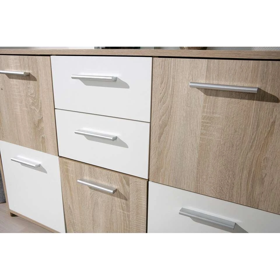 Commode Elvezia is een ladekast die speels omgaat met kleurverdeling. De deuren en lades zijn een combinatie van Sonoma eikenhout met wit. Alle opbergvakken zijn voorzien van afgeronde RVS grepen. De lades hebben geleiders voor extra gebruiksgemak. Kast Elvezia is gemaakt van spaanplaat met en sterk en tijdloos karakter. Vijf deurtjes en twee lades verschaffen je meer dan genoeg opbergruimte. De kast kan in verschillende ruimtes worden geplaatst. Hierbij kun je denk en aan de hal, garderobe of woonkamer.