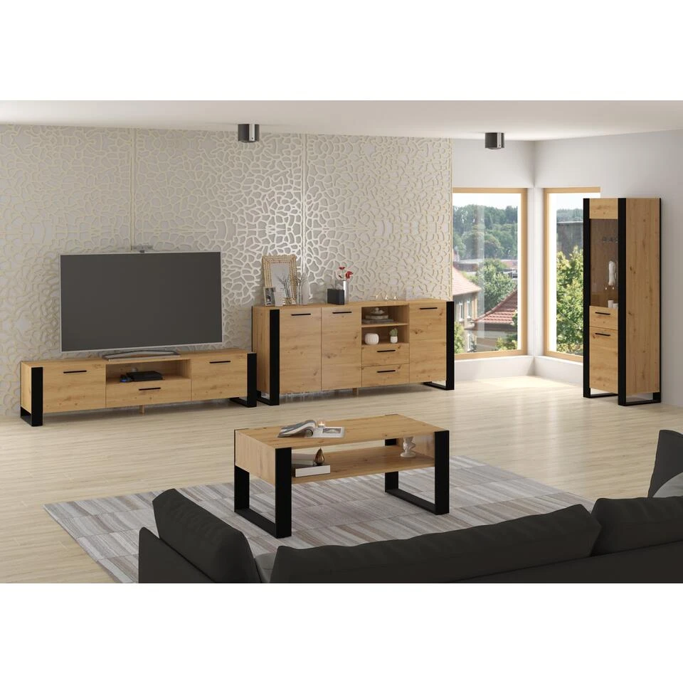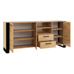 Zeer elegante en stijlvolle ladekast voor woon- of slaapkamer, uitgevoerd in modieuze en natuurlijke kleuren. Hij wordt gekenmerkt door een moderne en oogstrelende uitstraling – zijn charme wordt bepaald door grote zwarte poten in de vorm van een frame, die contrasteert mooi met de rest van het meubel.De kast heeft twee gesloten planken, twee open planken en twee lades.