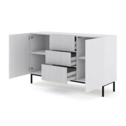 Meubels uit de gepresenteerde Ravenna-collectie worden gekenmerkt door elegantie en een uniek uiterlijk. Ze zullen geschikt zijn voor moderne arrangementen en het interieur van de woonkamer of eetkamer veranderen. De eenvoud van de vormen harmonieert perfect met de gefreesde fronten. Het metalen frame ondersteunt de body zorgt voor stabiliteit en voegt stijl en expressiviteit toe.