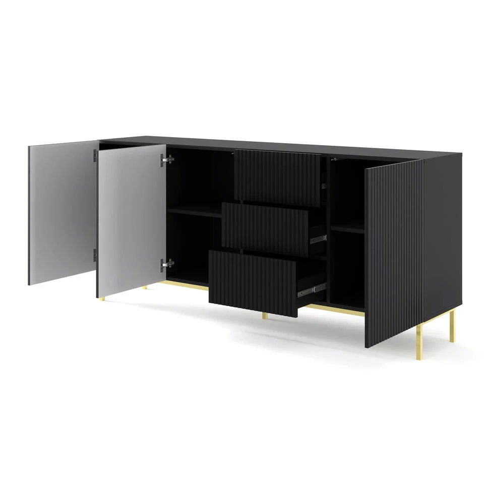 Meubels uit de gepresenteerde Ravenna-collectie worden gekenmerkt door elegantie en een uniek uiterlijk. Ze zullen geschikt zijn voor moderne arrangementen en het interieur van de woonkamer of eetkamer veranderen. De eenvoud van de vormen harmonieert perfect met de gefreesde fronten. Het metalen frame ondersteunt de body zorgt voor stabiliteit en voegt stijl en expressiviteit toe.