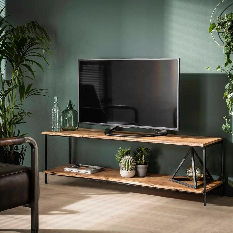 Tv-meubel Erwin zorgt gemakkelijk voor een stoere en natuurlijke sfeer in de woonkamer of slaapkamer. Dit meubel is uitgevoerd in prachtig acaciahout met een dikte van 11 mm en een gave houtstructuur. Hij is uitgerust met twee royale schappen, zodat er genoeg plaats is voor de tv, bijpassende accessoires en leuke decoratieve items. Om het stoere karakter extra te benadrukken, is dit meubel voorzien van een stevig zwart metalen frame. Combineer dit item ook met de perfect bijpassende Erwin wandkast voor één geheel in uw interieur. Tv-meubel Erwin voelt zich het beste thuis in een stoere, moderne, industriële of natuurlijke woonstijl.
