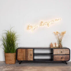 Tv-meubel Retro groot Tv-meubel Retro is gemaakt van hardhout met een zwart metalen frame wat hem een vintage look geeft. Het tv-meubel heeft 1 dichte opbergkast en twee lades waarin je spullen in kan opbergen die je liever niet in het zich hebt. In het midden heeft tv-meubel retro een open ruimte met 2 planken waarop jij jouw mooiste accessoires kan tonen.