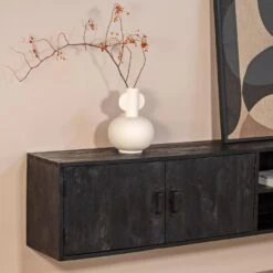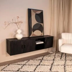 Dit zwevend tv-meubel is gemaakt van mangohout in combinatie met ijzer en is in het zwart afgewerkt. Dit tv-meubel geeft de mogelijkheid om al je apparatuur in de kast te bewaren en netjes weg te werken. Met zijn stoere uiterlijk past hij binnen een industrieel interieur. Is dit het tv-meubel dat je zoekt? Bestel hem dan direct online op en profiteer van onze gratis verzending bij een besteding boven de 100,-.