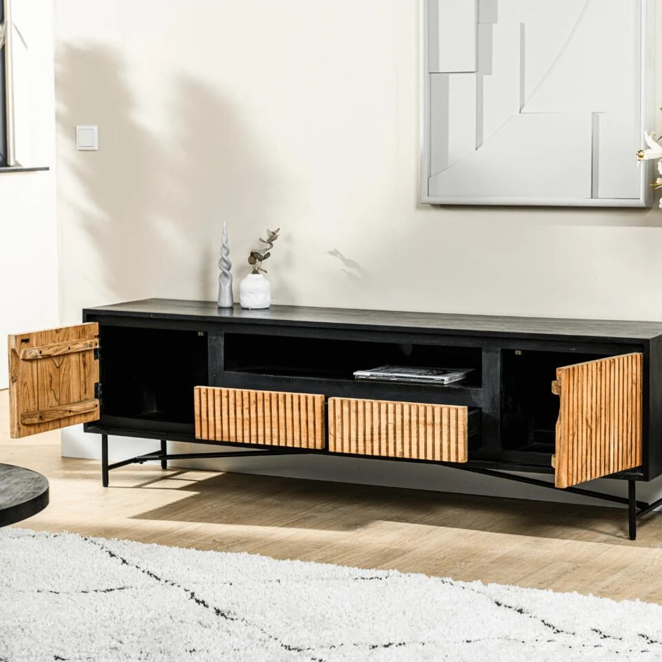 Het Haki tv-meubel is een stijlvol en functioneel meubelstuk van het woonmerk Vurna. Met een lengte van 180cm biedt dit meubelstuk voldoende opbergruimte voor al jouw spullen. De combinatie van natuurlijk acaciahout en zwarte acaciahout geeft het meubelstuk een eigentijdse uitstraling en past goed in moderne interieurs. Het tv-meubel heeft drie opbergplekken die ideaal zijn om jouw spullen uit het zicht te leggen wanneer je tv aan het kijken bent. De deurtjes hebben een mooi ribbel patroon en hebben een natuurlijke acaciahout look wat zorgt voor een prachtig contrast met het andere zwarte hout. Dit geeft het meubelstuk een eigentijdse uitstraling en maakt het een echte blikvanger in jouw woonkamer. Het onderstel van het Haki tv-meubel heeft smalle poten wat zorgt voor een frisse en moderne uitstraling. Dit meubelstuk past in zowel grote als kleine ruimtes door zijn breedte van 180cm. Het biedt niet alleen voldoende opbergruimte, maar is ook ideaal om accessoires of te plaatsen. Het Haki tv-meubel is van hoogwaardige kwaliteit en is gemaakt van duurzame materialen die zorgen voor langdurige duurzaamheid en functionaliteit. Het is een perfect meubelstuk voor iedereen die op zoek is naar een moderne en stijlvolle opslagoplossing. Haki is verkrijgbaar in verschillende uitvoeringen, kijk hiervoor op onze website.