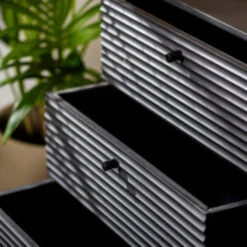 Deze trendy dressoir is gemaakt van hoogwaardig acaciahout en heeft een zwart metalen onderstel. Het meubel is naast dat het heel praktisch is ook nog is een echte eye-cachter bij jou in de woonkamer. De afwerking van de deurtjes met verschillende latjes zorgt voor een speels effect. Het meubel beschikt over 2 grote deuren met daarachter 2 handige opbergvakken, daarnaast heeft het meubel ook 3 handige lades. Door het metalen onderstel oogt het meubel heel ruim. Dit meubel maakt deel uit van een serie en is ook te krijgen in een wandkast en TV-meubel.