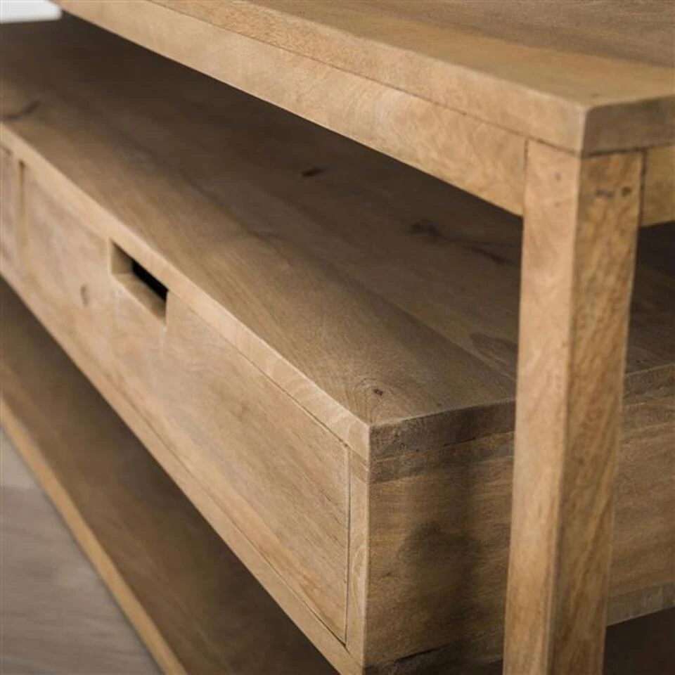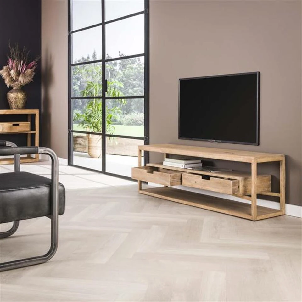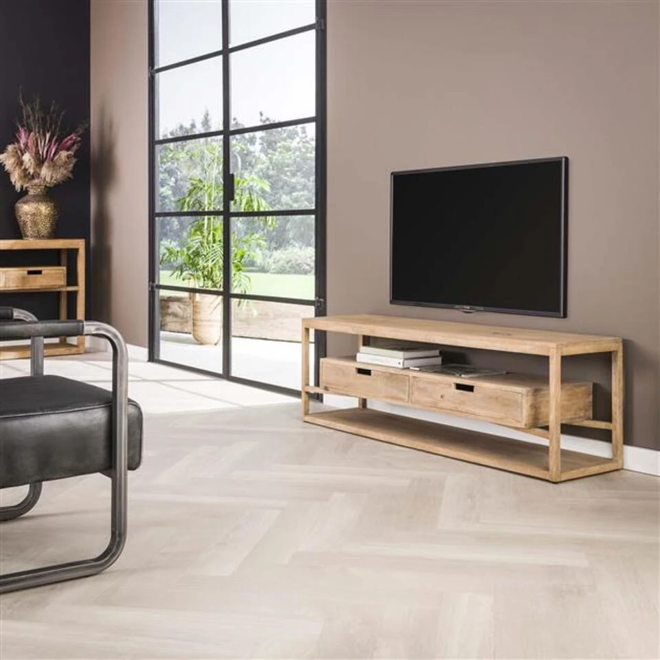 Dit TV-meubel ‘Sahara’ is uitgevoerd in mango hout met een zandkleur, net zoals de Sahara woestijn. Het tv-meubel heeft twee lades, steunend op planken in het midden van het meubel waardoor de lades een zwevend effect krijgen. Dit tv-meubel maakt deel uit van de Sahara serie, bestaande uit twee nachtkastjes, een halftafel, een dressoir en een tv-meubel.