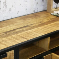 Dit industriële tv-meubel van mangohout heeft een vintage industriële look en is niet alleen stijlvol, maar ook erg praktisch door de vier ruime vakken achter de deuren. Dit zorgt voor veel opbergruimte voor de spullen die je liever niet tentoon stelt. In het open vak is plaats voor je apparatuur. Je zithoek blijft voortaan opgeruimd dankzij de twee deurtjes en lades! De twee vakken zijn 29cm breed, 12cm hoog en 41,5cm diep.