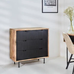 Industriële ladekast Felix is gemaakt van mangohout. Het mangohout heeft een duidelijk zichtbare houtstructuur, waardoor de wandkast een stoere en levendige uitstraling krijgt. Het mangohout heeft een lichte basiskleur en kenmerkt zich door ruige en donkere accenten. De lades van de Felix zijn zwart geverfd. Op zoek naar hout dat mooi, duurzaam en enorm sterk is? Dan is een product van mangohout precies wat je zoekt!Â