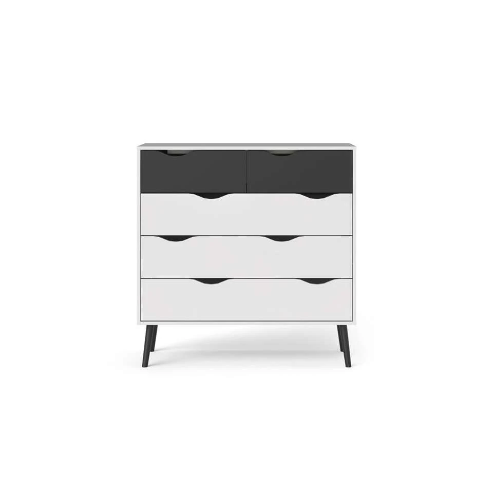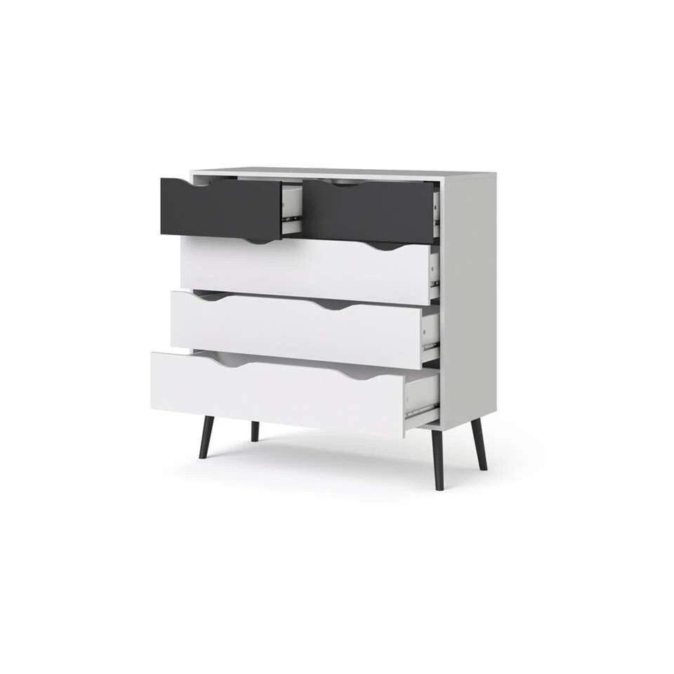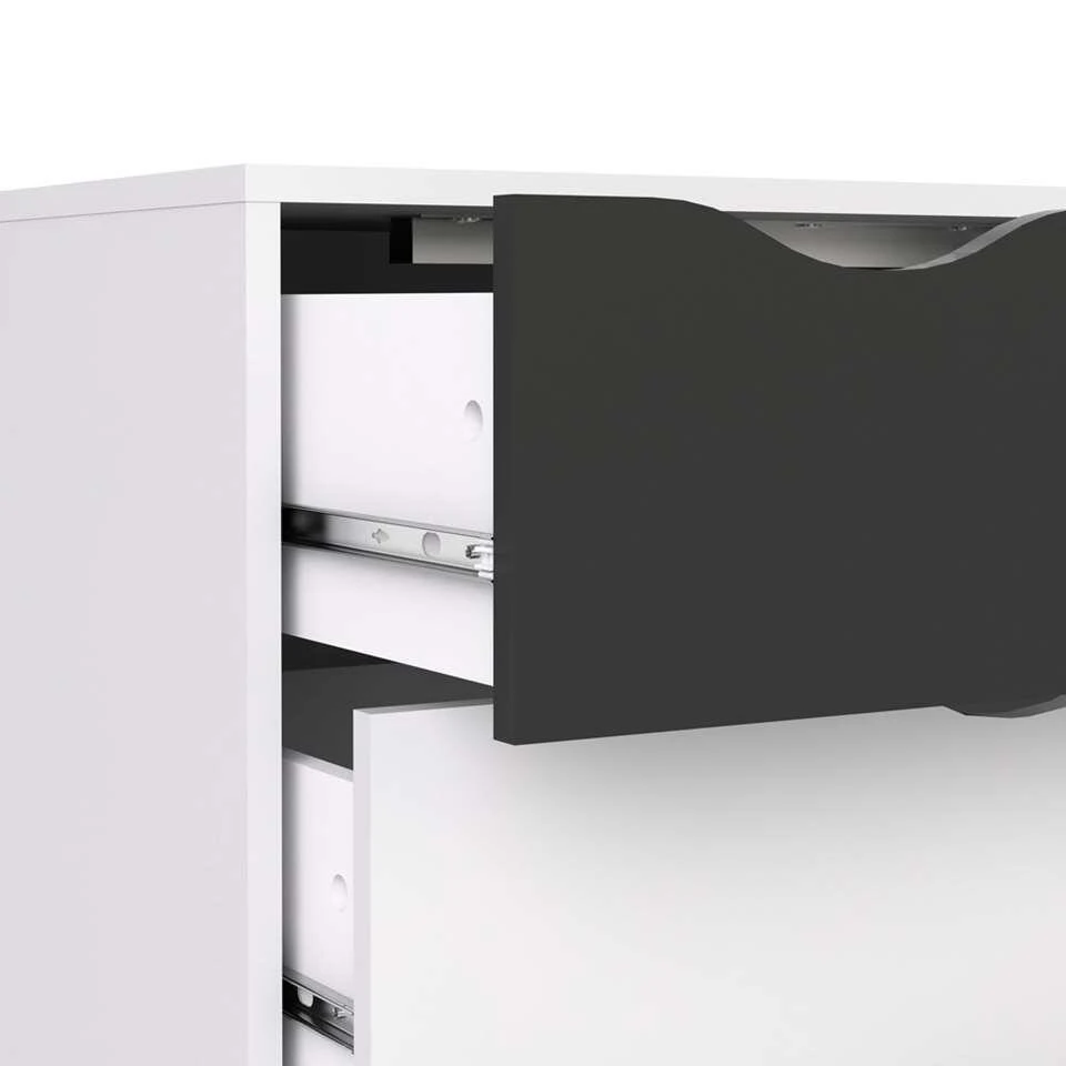 Ladekast Delta is een moderne kast voor in de woonkamer, maar ook in de slaapkamer staat deze kast mooi. De Delta heeft een strakke vormgeving en is wit met mat zwart van kleur. Deze ruime en praktische kast staat goed in elk modern interieur. Berg alles netjes op in dressoir Delta. Dit praktische en stijlvolle meubel is gemaakt van spaanplaat.