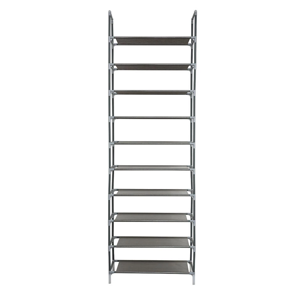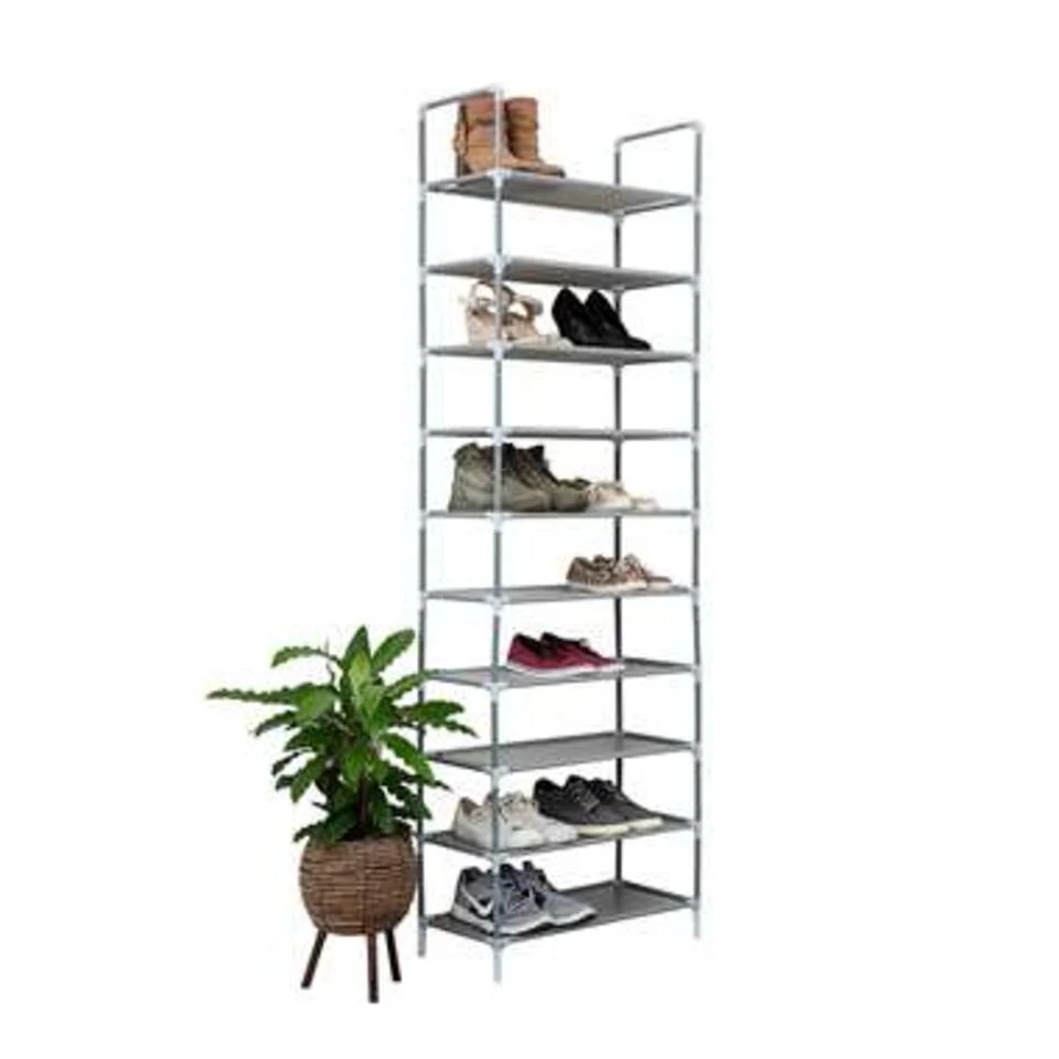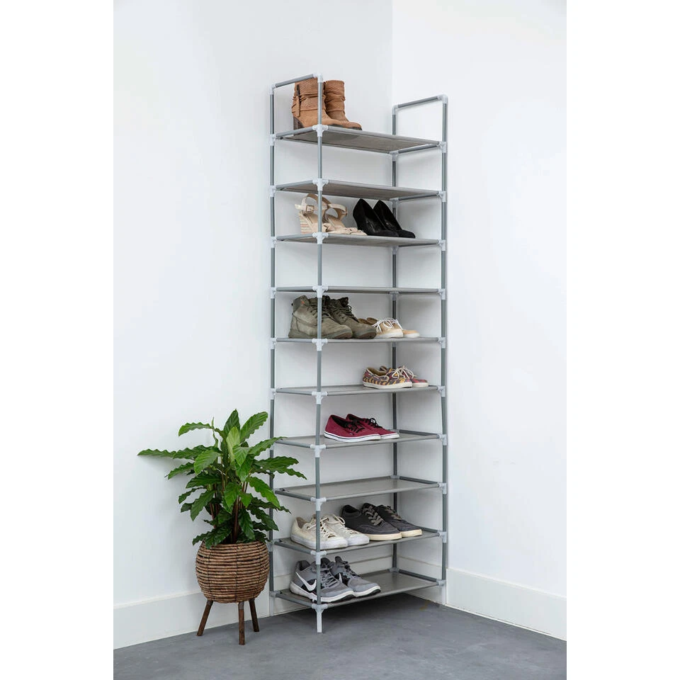 Met dit grijze metalen schoenenrek geef je 20 paar schoenen een mooie plek in huis. Stevig en hoog, ideaal wanneer je veel schoenen in en kleine ruimte netjes wilt opbergen. Het vlies van de schappen is waterafstotend waardoor water van natte schoenen niet intrekt. Vuil als stof en zand veeg je bovendien gemakkelijk af met een vochtige doek. De poten zijn van kunststof zodat je geen krassen maakt op je vloer. Je zet het schoenenrek snel en makkelijk in elkaar. Het rek is verplaatsbaar, maar kan voor extra stevigheid ook met de bijgeleverde pluggen aan de muur worden bevestigd.