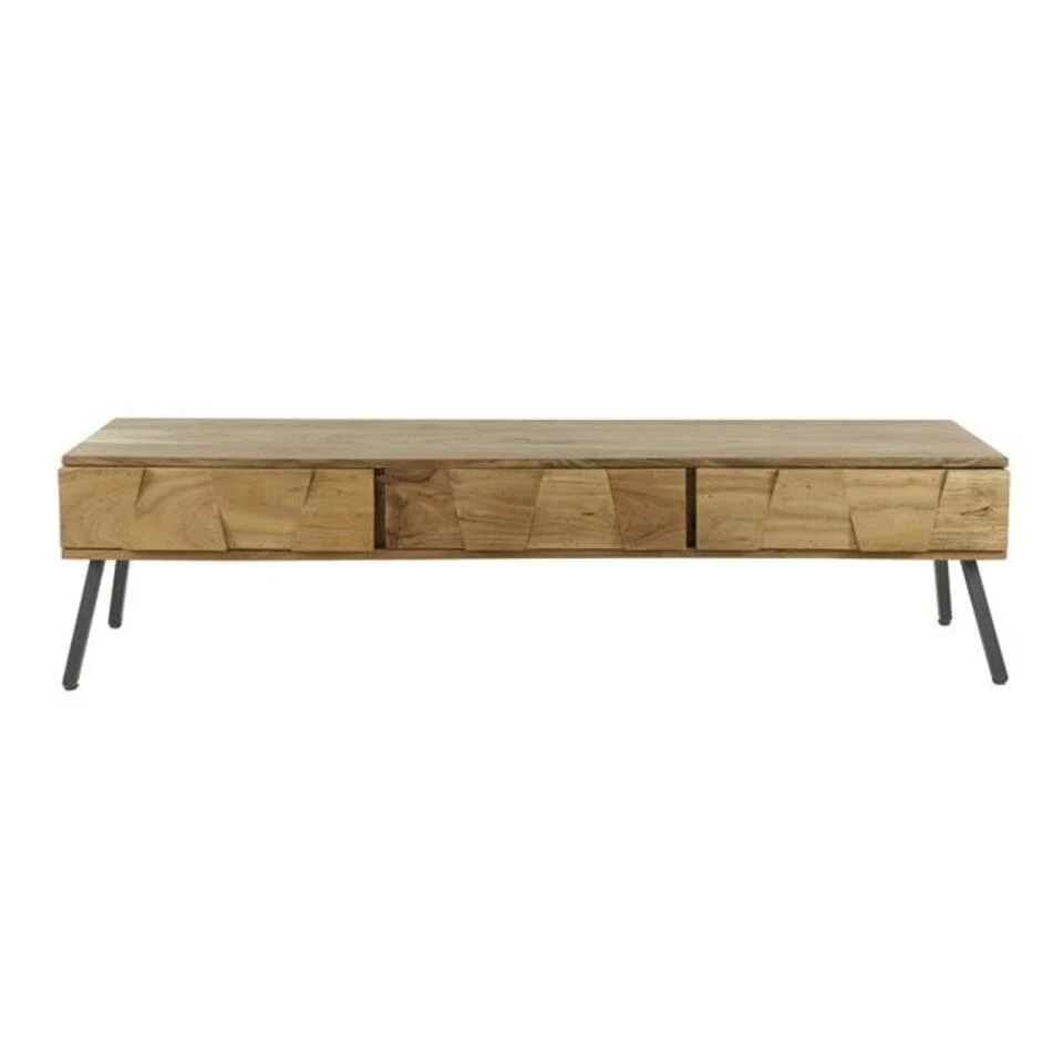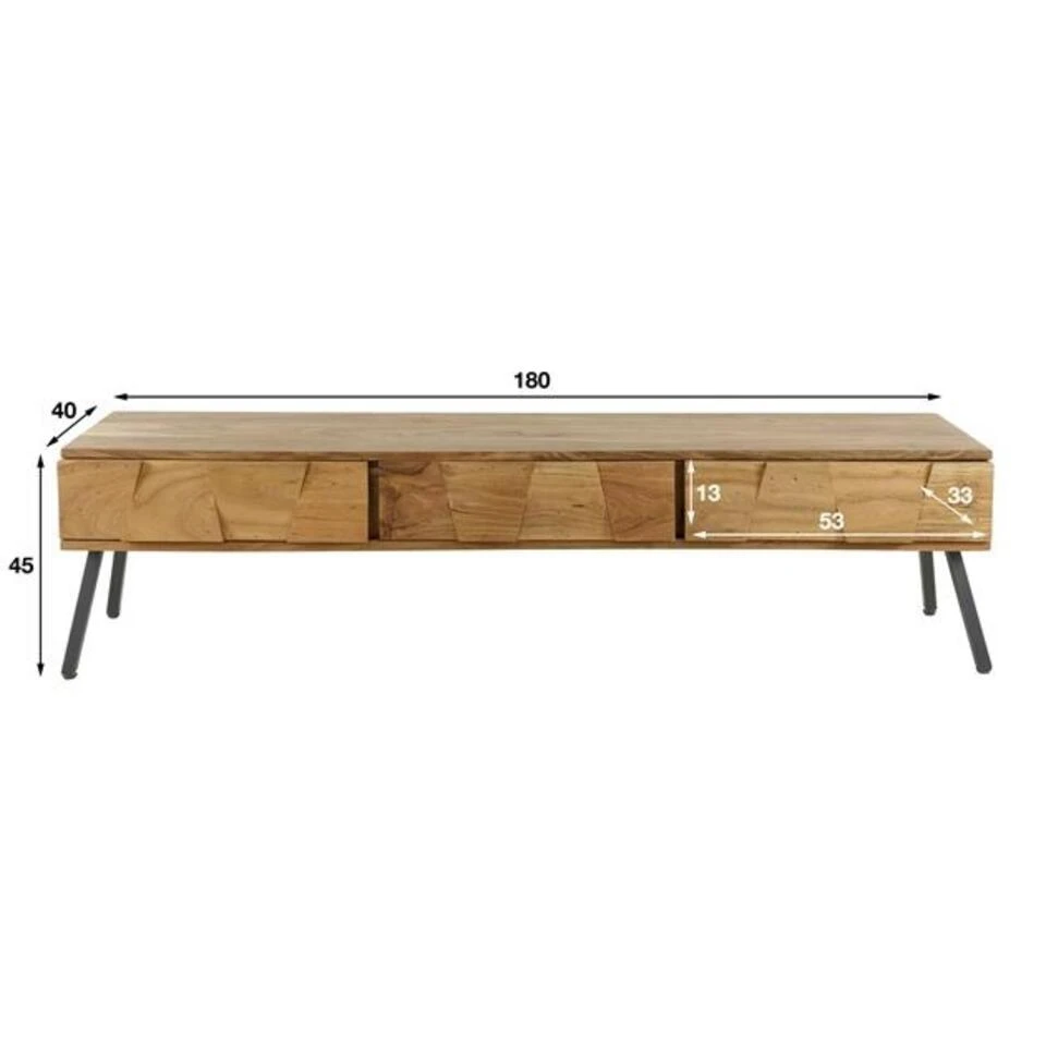 Het TV-meubel is gemaakt van acaciahout. Acacia is een duurzame loof houtsoort. Kenmerkend aan deze houtsoort zijn de wisselingen in kleur, de vlamtekening en fijne nerf. Deze eigenschappen geven meubels van deze houtsoort een warme uitstraling. Het voegt direct veel sfeer toe aan je interieur. Acaciahout is een natuurproduct, dit betekent dat er onregelmatigheden in vorm en kleur kunnen voorkomen. De TV-kast staat op een zwart metalen frame.