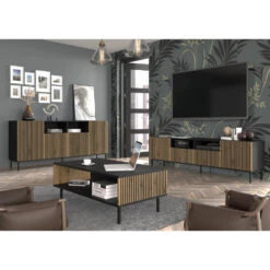 De tv-kast past perfect in de inrichting van de woonkamer en maakt functionele opslag mogelijk. Het is uitgerust met twee kasten, twee planken en twee lades.