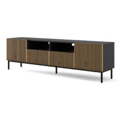 De tv-kast past perfect in de inrichting van de woonkamer en maakt functionele opslag mogelijk. Het is uitgerust met twee kasten, twee planken en twee lades.