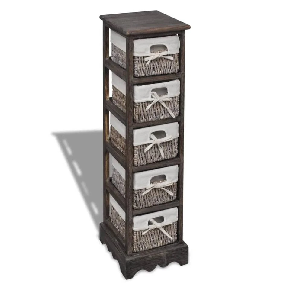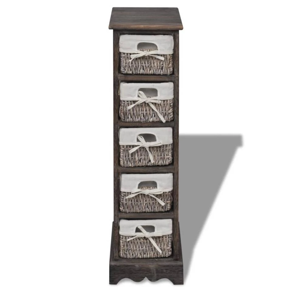 Dit kastje wordt compleet met 5 rattan manden geleverd en biedt meer dan genoeg ruimte om je spullen te bewaren. Tegelijkertijd geeft het meubelstuk ook een beetje stijl aan de kamer. Ons houten kastje wordt zeker een van je favoriete meubelstukken.