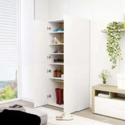 De halkast is gemaakt van bewerkt hout wat buitengewoon stevig en duurzaam is. De schoenenkast heeft 6 schappen, die voldoende ruimte bieden om je schoenen goed geordend te houden. Dankzij de 2 deuren beschermt de kast je schoenen tegen stof en houdt hij ze uit het zicht.