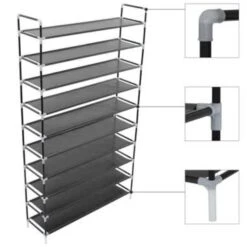 Het heeft een buisvormig, metalen frame dat lichtgewicht en toch stevig is, waardoor het schoenenrek gemakkelijk te verplaatsen en vrij duurzaam is. Het heeft 10 royale schappen die gemaakt zijn van milieuvriendelijke, nonwoven stof en voldoende ruimte bieden om je schoenen geordend en opgeborgen te houden.