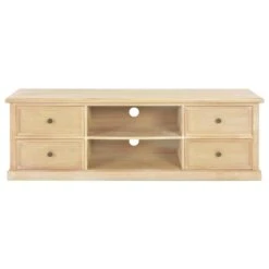 Dit moderne tv-meubel, gemaakt van MDF, massief grenenhout en een uniek paulownia fineer, is een tijdloze aanvulling zijn op je huis. Het heeft 4 lades voor het opbergen van snuisterijen en 2 open vakken voor het plaatsen van multimedia-apparaten, spelconsoles en tijdschriften.