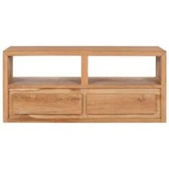 Dit tv-meubel in vintage stijl is gemaakt van massief teakhout, waardoor het een tijdloze aanvulling op je huis is. Elke stap van het proces wordt met de grootste zorg uitgevoerd, of het nu gaat om polijsten, schilderen of lakken. Dankzij het versterkte frame is het tv-standaard zeer stabiel en duurzaam. Het meubel heeft 2 lades voor het bewaren van snuisterijen en 2 open vakken voor het bewaren van multimedia-apparaten, spelconsoles en tijdschriften.