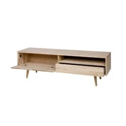 Woood tv-meubel Tygo is gemaakt van onbewerkt eikenhout. Dit kastje heeft een open vak en een vak met een klep. Hier is ruimte voor bijvoorbeeld een receiver, HD-ontvanger of een router. In de lade is ruimte voor allerhande losse spullen. Dit meubel heeft een retrolook en je kunt hem gemakkelijk combineren met andere meubelen.